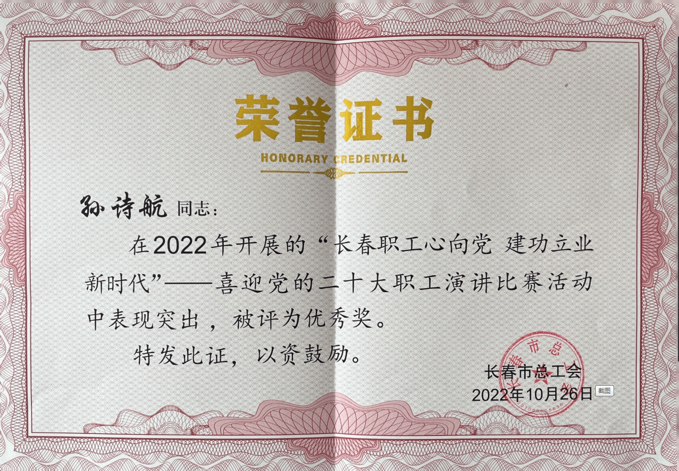 经过激烈角逐,长春市中心医院邱爽获得第一名、长春市中医院彭晓杰获得第二名、长春市妇产医院何新颖获得第三名、吉林工商学院孙诗航获得第四名。这四名选手代表长春市教科文卫体工会参加了长春市总工会举办的决赛。最终我校团委孙诗航获得“长春职工心向党 建功立业新时代”——喜迎党的二十大职工演讲比赛优秀奖。