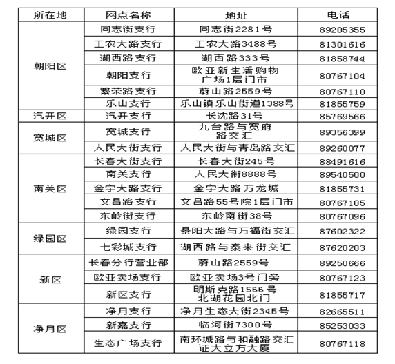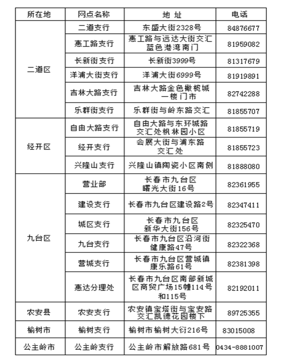 九台农商银行支行(分理处)地址一览表