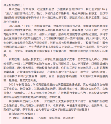 线上线下齐发力,致敬巾帼显温情。2月28日至3月4日,妇女节线上知识答题活动有序开展,题库涵盖女性权益保障、师德师风建设、生活实用常识等内容,以寓教于乐的形式强化知识储备。各分工会组织女教职工参与电子版问卷答题,学校工会为完成答题的女教职工发放精美纪念品,红色礼盒承载着满满的心意与祝福,以趣味互动传递关怀,以知识学习赋能成长。3月8日当天,学校官方网站、微信公众号同步推送《“三八”国际劳动妇女节致女教职工的慰问信》,向坚守在教育教学、行政管理、后勤服务各岗位的女教职工致以诚挚节日问候与崇高敬意。