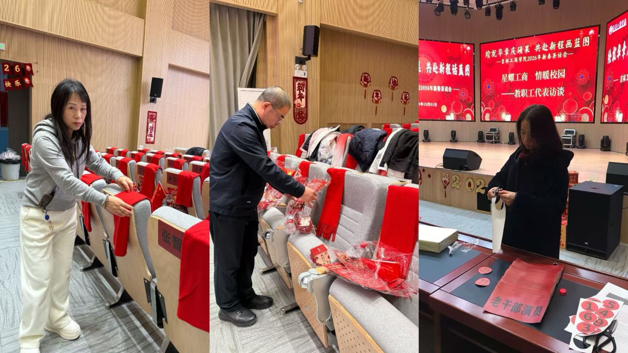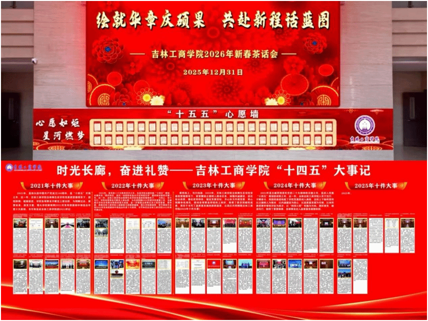 自茶话会筹备工作启动以来,工会第一时间牵头拟定详细活动方案,从主题确定、流程设计,到参会人员统筹、直播渠道搭建,每一个环节都反复推敲、精益求精,确保活动流程规范有序、内容丰富饱满。围绕“绘就华章庆硕果,共赴新程话蓝图”的核心主题,工会工作人员定制时光长廊,奋进礼赞——吉林工商学院“十四五”大事记主题展板和“十五五”心愿墙,将学校“十四五”期间的发展硕果和师生对“十五五”的殷切期盼与美好寄语融入设计,既彰显了校园文化底蕴,又传递出新春喜庆氛围。